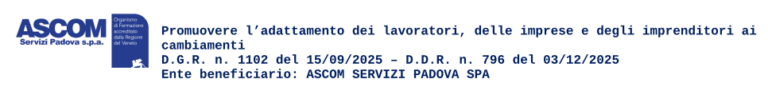 Ascom Servizi Padova SPA, in qualità di Ente beneficiario, ha ricevuto il finanziamento al proprio progetto cod. 35-0001-1102-2025 “LABORATORIO SACCISICA” presentato a valere sulla D.G.R. n. 1102 del 15/09/2025 – “WELL-FARE – Il welfare che connette. Reti territoriali per il welfare aziendale” ed approvato nell’ambito PR Veneto FSE+ 2021-2027 con D.D.R. n. 796 del 03/12/2025. Il progetto è realizzato grazie ai Fondi europei della Regione del Veneto.