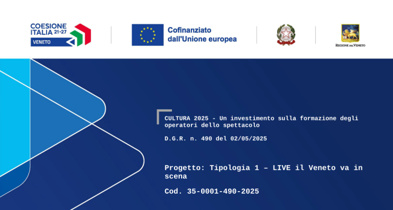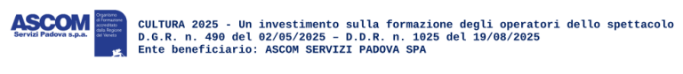 Ascom Servizi Padova SPA, in qualità di Ente beneficiario, ha ricevuto il finanziamento al proprio progetto cod. 35-0001-490-2025 “LIVE il Veneto va in scena” presentato a valere sulla D.G.R. n. 490 del 02/05/2025 – “Cultura 2025 – Un investimento sulla formazione degli operatori di spettacolo” ed approvato nell’ambito PR Veneto FSE+ 2021-2027 con D.D.R. n. 1025 del 19/08/2025. Il progetto è realizzato grazie ai Fondi europei della Regione del Veneto.